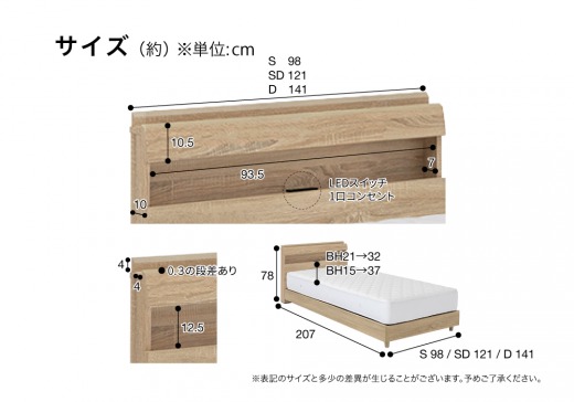 S(シングル)サイズはコンパクトにまとめた1人用サイズ。SD(セミダブル)サイズはゆったり寝心地の1人用でベッド下収納も更にワイドサイズ。D(ダブル)サイズは2人用で広々。必要に応じてサイズを選べます。