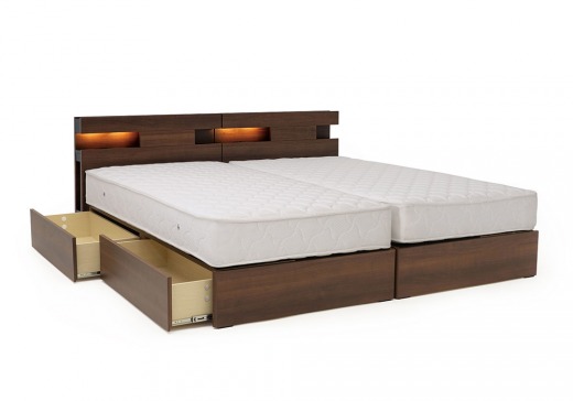 ベッド下側面に引出が付いたBOXタイプ、脚元スッキリのLEGタイプの2タイプから選べるベッドフレーム。スマホの充電などに便利なコンセントと雰囲気のあるLED照明付き。