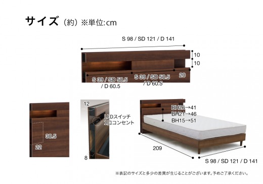 S(シングル)サイズはコンパクトにまとめた1人用サイズ。SD(セミダブル)サイズはゆったり寝心地の1人用でベッド下収納も更にワイドサイズ。D(ダブル)サイズは2人用で広々。必要に応じてサイズを選べます。