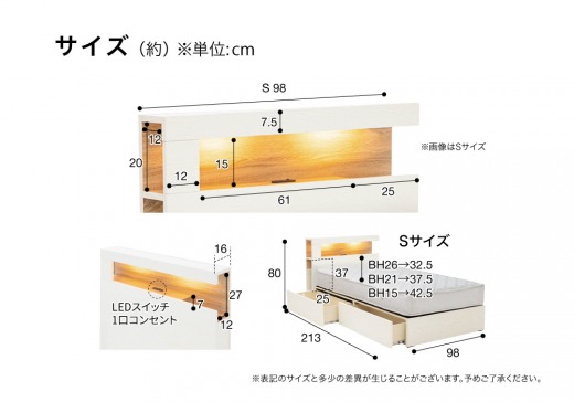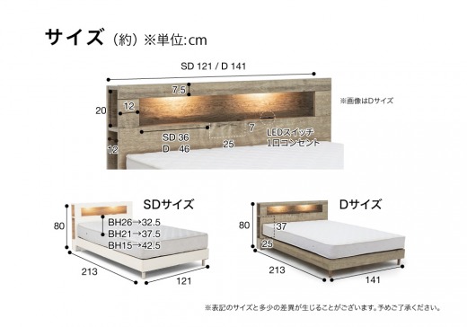 S(シングル)サイズはコンパクトにまとめた1人用サイズ。SD(セミダブル)サイズはゆったり寝心地の1人用でベッド下収納も更にワイドサイズ。D(ダブル)サイズは2人用で広々。必要に応じてサイズを選べます。