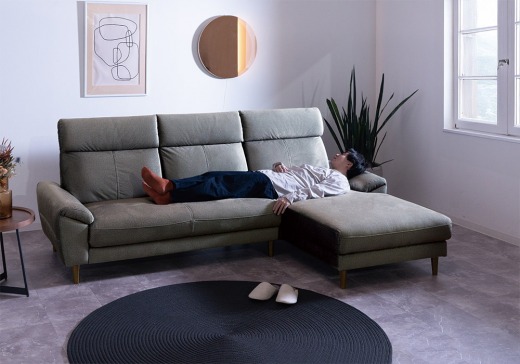 長時間使用しても疲れにくい硬めの座面です。斜めに降りた低めの肘はお昼寝用の枕としてもぴったり。