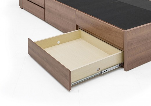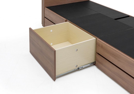 用途に合わせて収納ができる浅型(4杯)、深型(1杯)の便利な引出の組み合わせです。引出はベッドの左右どちらの向きでも取り付けが可能です。