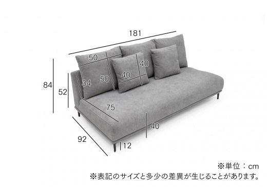 アームがないデザインなのでコンパクトでお部屋の様々な場所に置きやすいサイズ感。3人掛け相当の座面サイズはしっかり確保しています。様々な角度から腰掛けやすく、サイドテーブルも置きやすいフォルムです。