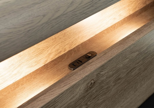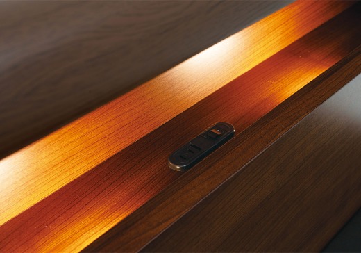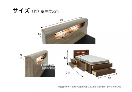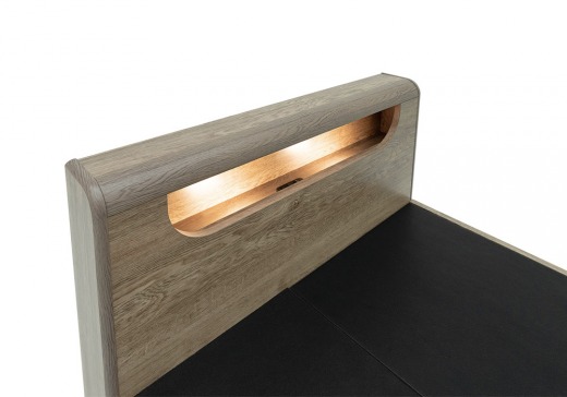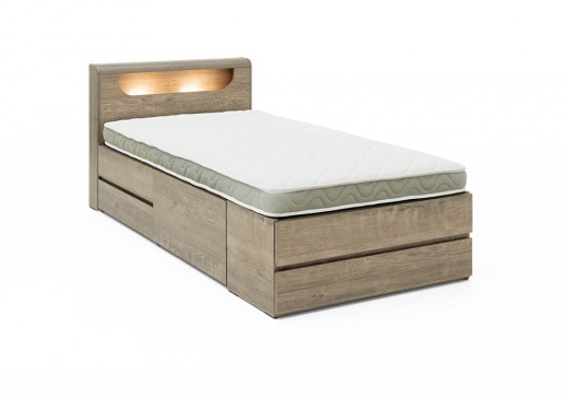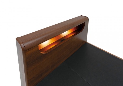 ヘッドボードには小物を置ける棚、コンセントやLED照明も備えており、空間を効率よく活用できます。