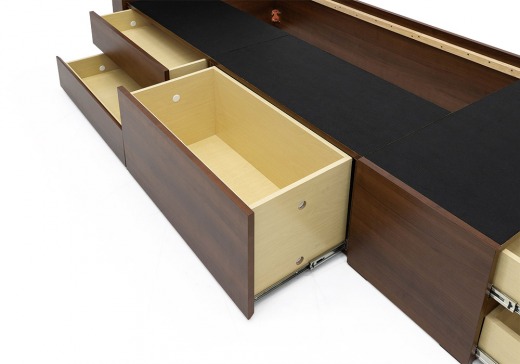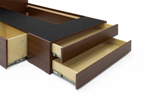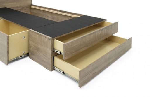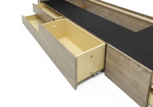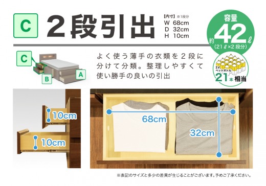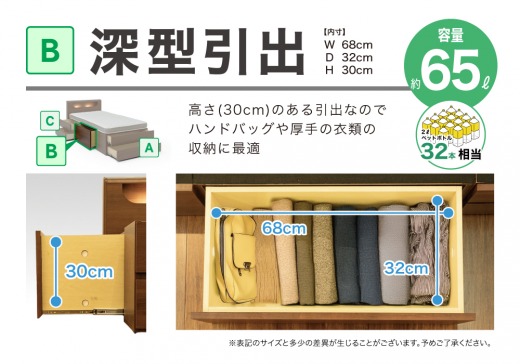 用途に合わせて収納ができる浅型(2杯)、深型(1杯)、フットドロワー浅型(2杯)の便利な引出の組み合わせです。引出はベッドの左右どちらの向きでも取り付けが可能です。