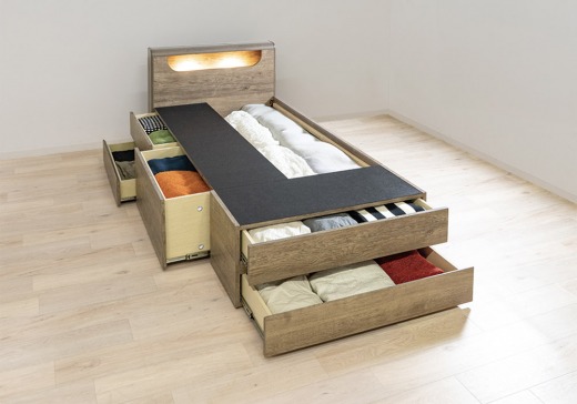 普段は快適な眠りの場として、同時に大容量収納も叶える多機能ベッドフレーム。